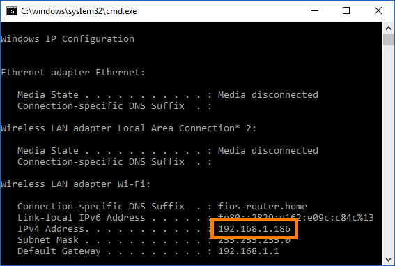 • In the resulting cmd window, find the IPv4 Address.